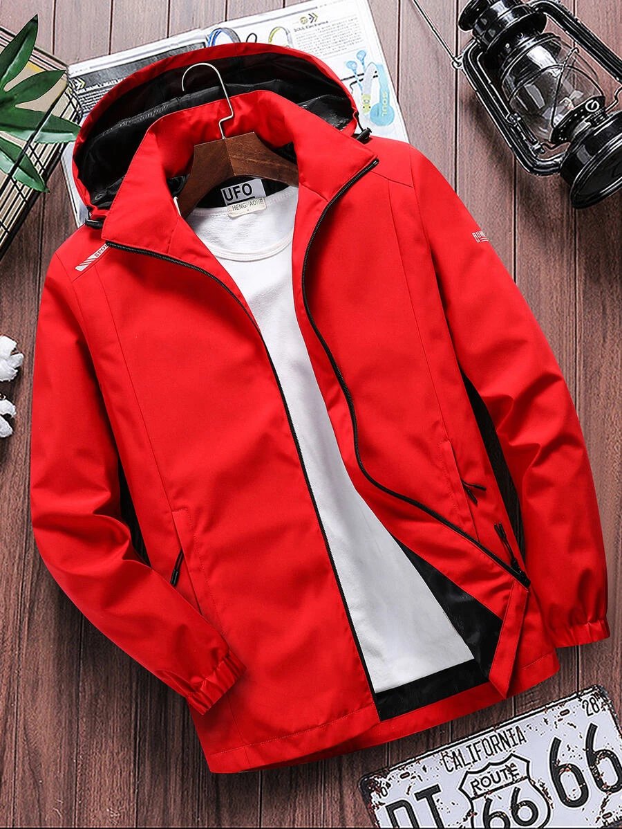 Color: Rojo Tipo: Rompevientos Detalles: Bolsillo, Cremallera Escote: capucha Tipos de Manga: Manga larga Longitud: Normal Abertura: Cremallera Material: Poliéster